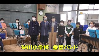砂川小学校の金管バンドです。3年生~6年生までのメンバーで、週二回の練習をしています。 今年度は、3年生も金管楽器に挑戦し、みんなで練習を積み重ねてきました。もっと練習をして、さらに素敵な演奏ができるように頑張っています。 今回演奏する曲は、「ファーストブロウ」と「かえるの合唱」の二曲です。